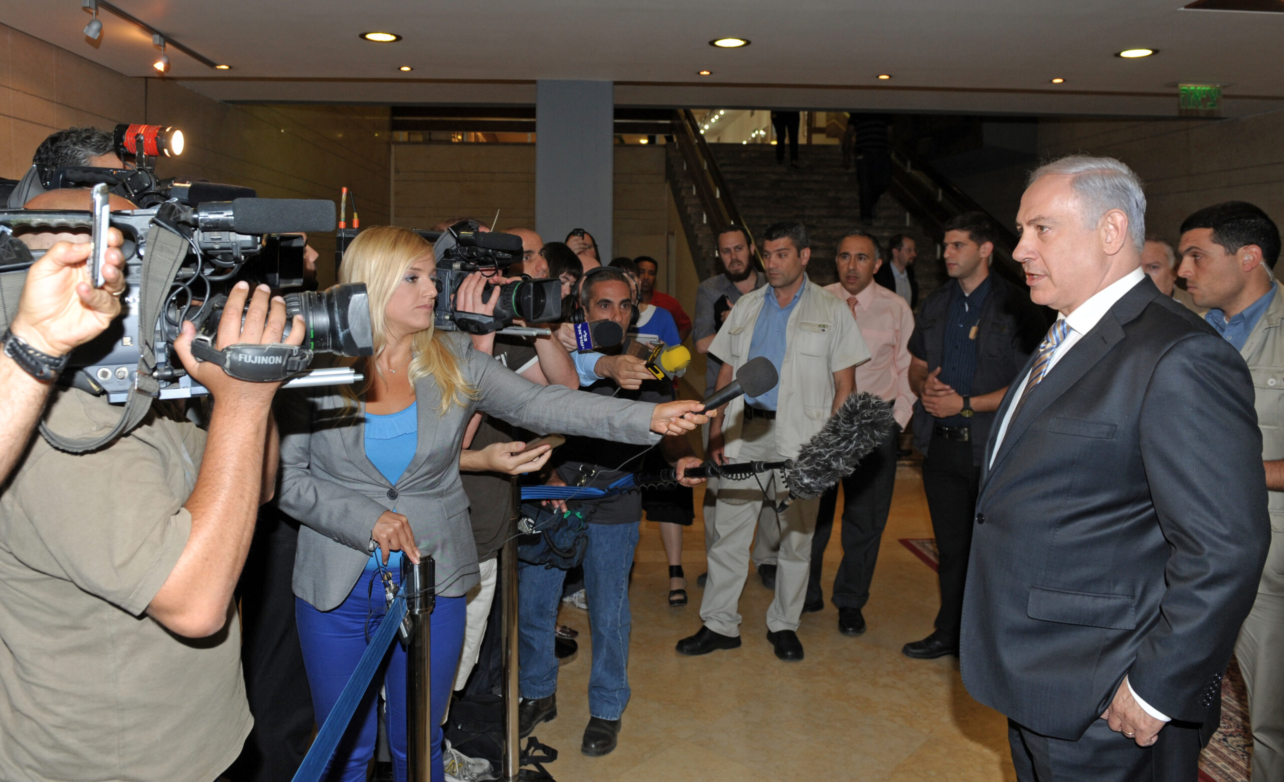 Prime Minister Benjamin Netanyahu (right) delivers an announcement to the press at the Knesset in Jerusalem